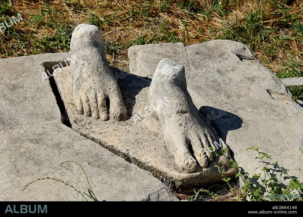 Caption: Feet, remains of a Kouros, excavations of the Heraion or sanctuary to the goddess Hera, UNESCO World Heritage Site, Samos island, southern Sporades, Aegean sea, Greece, Europe