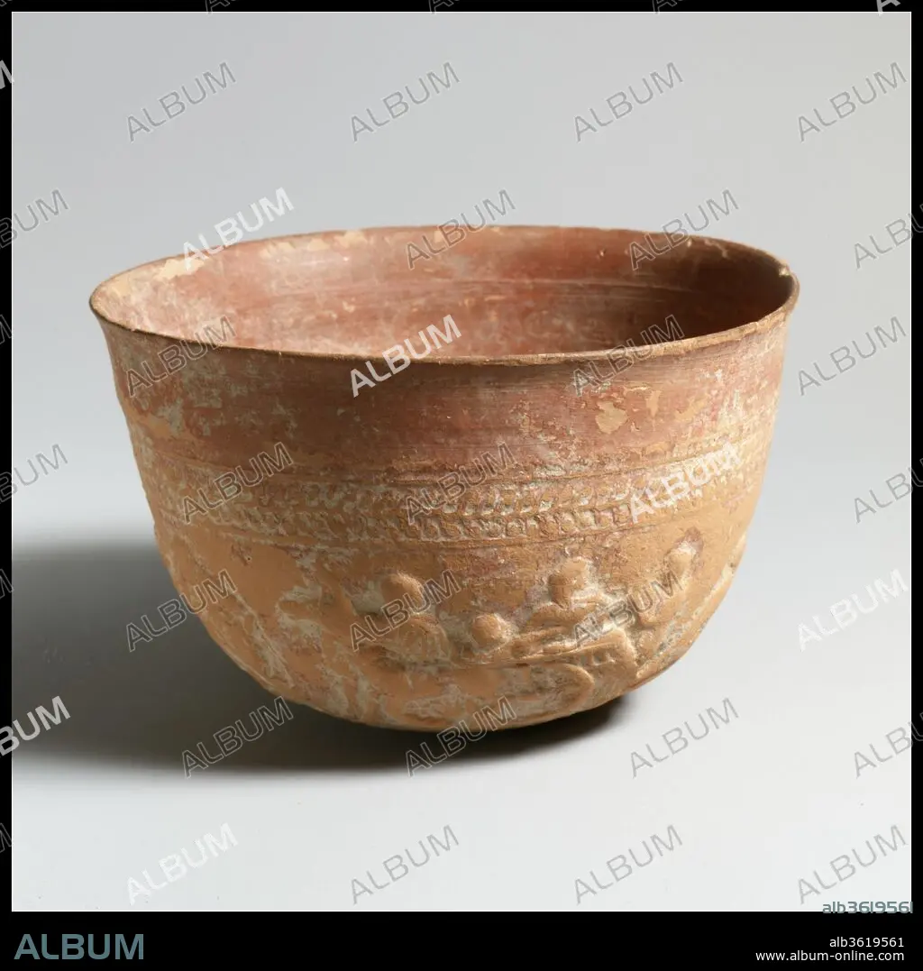 This vase belongs to a select group of bowls decorated in relief with scenes from epic poetry and from Classical Greek tragedy. Depicted here are five scenes from Euripides's play Iphigenia at Aulis, including inscriptions that identify the figures. Represented are: Agamemnon, who has weakened in his resolve to sacrifice his daughter to Artemis, biding his slave to take a letter to his wife, Clytemnestra, instructing her not to send her daughter to Aulis; Menelaos, Agamemnon's brother, taking the letter from the messenger by force; Menelaos, with the letter in hand, blaming Agamemnon for refusing to go through with the sacrifice; a messenger, bringing news to Agamemnon that Iphigenia has arrived; and the cart that has come from Argos, bearing Queen Clytemnestra and her children, Iphigenia and the little Orestes. The story continued on a second bowl, examples of which are preserved, again with five episodes, concluding with Iphigenia's meeting with Achilles. It is likely that a third bowl brought the story to its conclusion with Iphigenia's sacrifice.