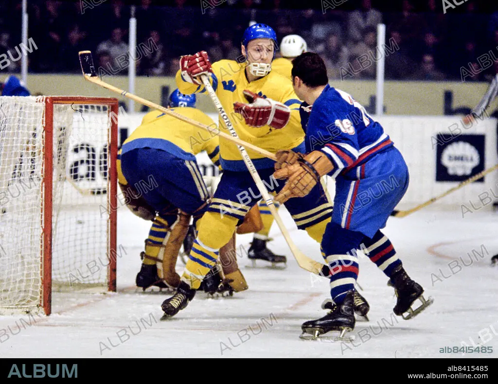 STOCKHOLM 1969 MARS. Tre Kronors Leif "Blixten" Henriksson fredar det svenska målet i ett av de två mötena mellan Sverige och Tjeckoslovakien i ishockey-VM i Stockholm i mars 1969.. Foto: Leif Engberg / DN / TT / Kod; 15. **SvD OUT**