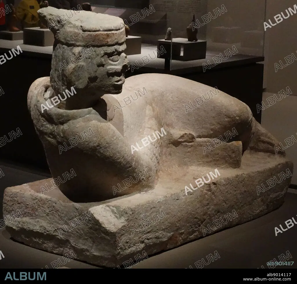 Caption: Chacmool (Chacmool) form of pre-Columbian, Mesoamerican sculpture, depicting a reclining figure with its head facing 90 degrees from the front, supporting itself on its elbows and supporting a bowl or a disk upon its stomach. These figures possibly symbolised slain warriors carrying offerings to the gods; Post-classical Mayan Period, 900-1250 AD; From Chichen Itza, Yucatan, Mexico