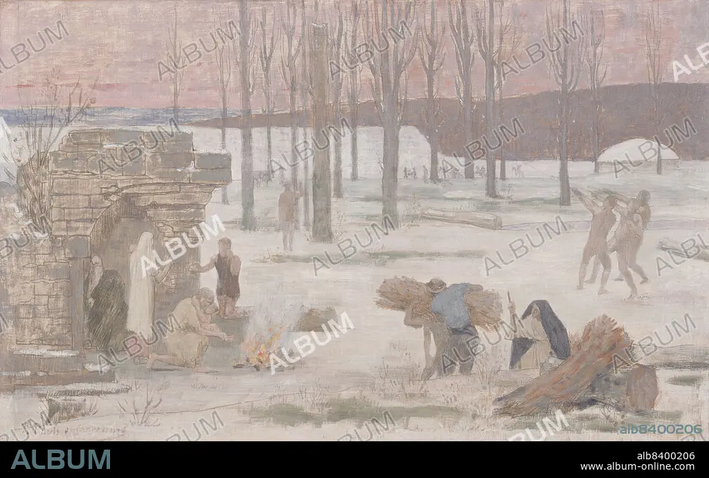 Caption: Winter, sketch for the Hôtel de Ville in Paris, between 1889 and 1892. The edge of a forest in a snowy landscape. Family at a wood fire in a ruined building. In the foreground, two men collect faggots under the gaze of an old woman in a black cape. On the right, three men pull down a tree. (L'Hiver, esquisse pour l'Hôtel de Ville de Paris).