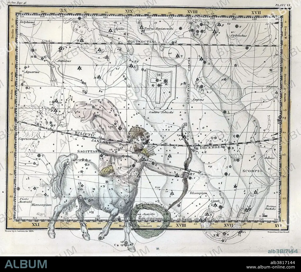 Caption: Sagittarius is a constellation of the zodiac, the one containing the galactic center. Its name is Latin for the archer. It is one of the 48 constellations described by the 2nd century astronomer Ptolemy, and remains one of the 88 modern constellations defined by the International Astronomical Union. Sagittarius is commonly represented as a centaur drawing a bow. It lies between Ophiuchus to the west and Capricornus to the east. In Greek mythology, Sagittarius is identified as a centaur: half human, half horse. Sagittarius is the ninth astrological sign, which is associated with the constellation Sagittarius. It spans the 240-270th degree of the zodiac, between 234.75 and 270 degree of celestial longitude, which the Sun transits on average between November 23 to December 21 each year. A Celestial Atlas (1822) by Alexander Jamieson, inspired by the star atlas of Johann Elert Bode, but restricted itself to stars that could be seen with the naked eye. Comprising a systematic display of the heavens in a series of thirty maps illustrated by scientific description of their contents and accompanied by catalogues of the stars and astronomical exercises, plate 20, 1822.