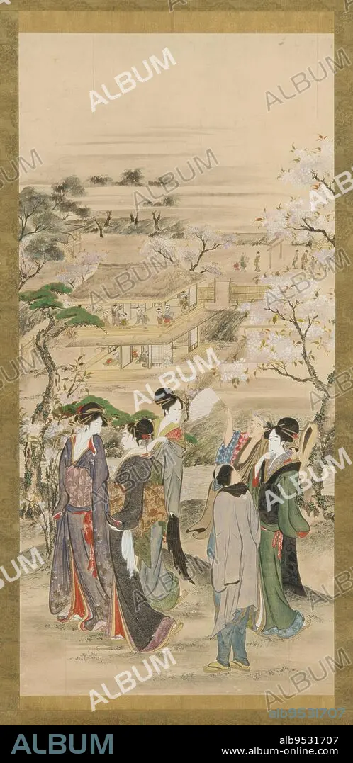 Landscape: parties of men and women looking at cherry blossoms. Origin: Japan. Period: Edo period. Date: 1760-1849. Color on paper.