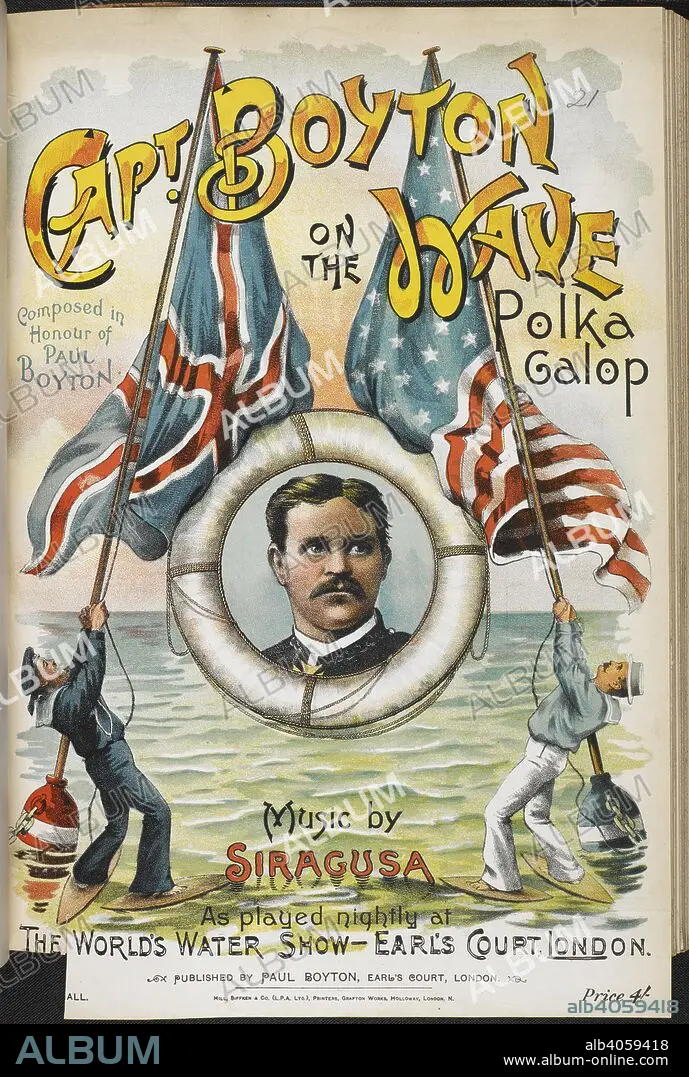 Caption: Illustrated music cover with a portrait of Captain Boyton. Captain Boyton on the Wave. Polka-Galop, etc. London : P. Boyton, [1893]. Paul Boyton (June 29, 1848 - April 19, 1924), known as the Fearless Frogman, was a showman and adventurer. He is best known for his water stunts that captivated the world, including crossing the English Channel in a novel rubber suit. Source: h.3285.u.(21.) front cover.