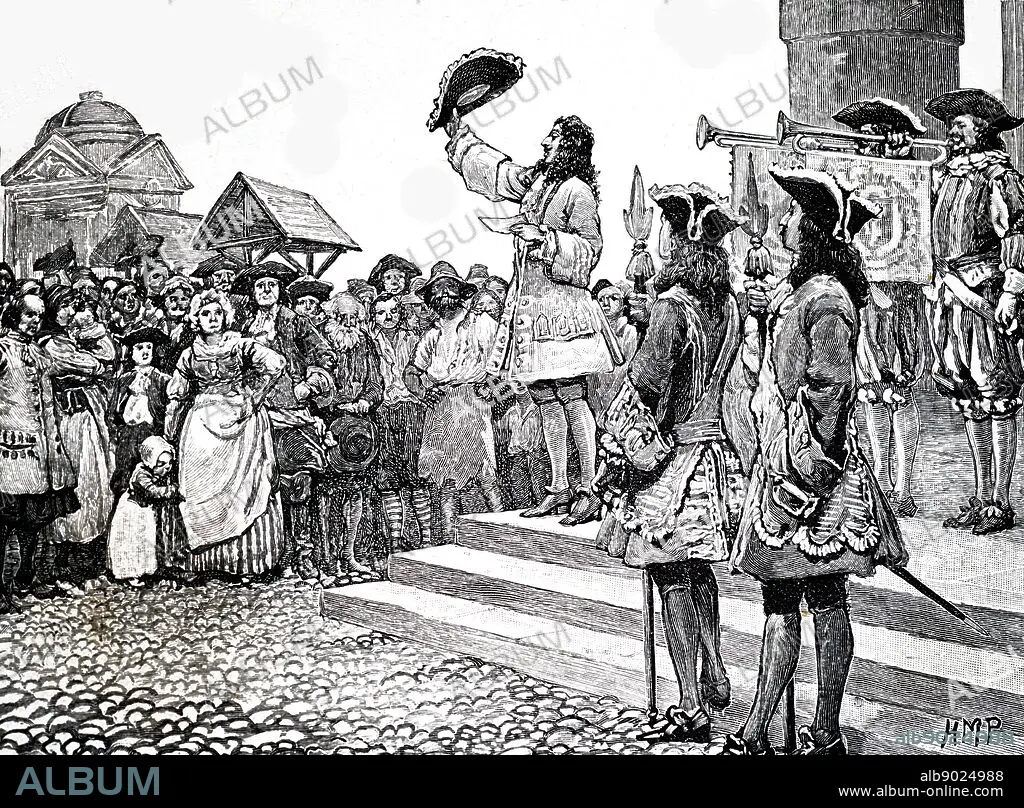Caption: Illustration showing The pretender proclaimed King of England by order of Louis XIV. James Francis Edward, Prince of Wales (1688 - 1766), nicknamed the Old Pretender, was the son of King James II of England. Only months after James Francis Edward's birth, his Catholic father was deposed and exiled in the Glorious Revolution of 1688. James Francis Edward was raised in Continental Europe and after his father's death in 1701, he claimed the English, Scottish and Irish crown as James III of England and Ireland and James VIII of Scotland, with the support of his Jacobite followers and his cousin Louis XIV of France. Fourteen years later, he unsuccessfully attempted to gain the throne in Britain during the Jacobite rising of 1715.