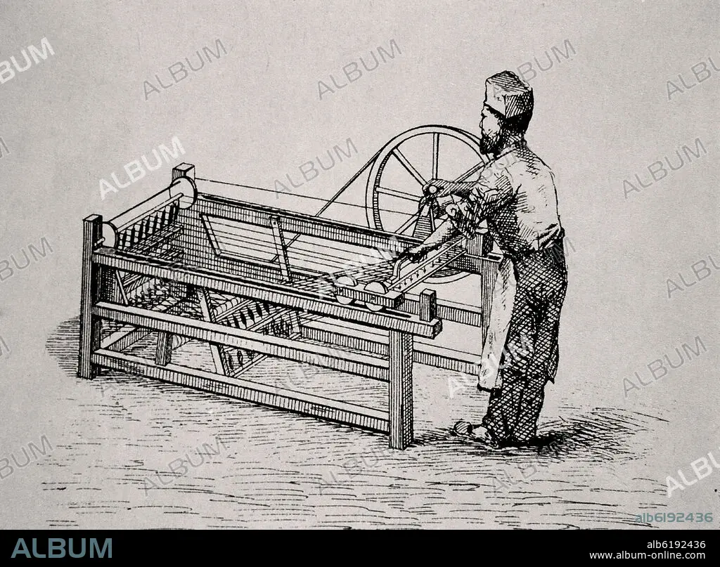 Caption: ENGRAVING OF SPINNING MACHINE KNOWN AS SPINNING JENNY - 1764