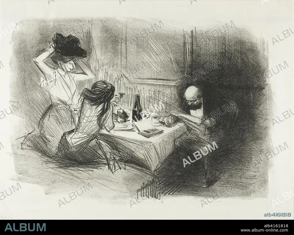 Caption: The Private Dining Room, Fifth Plate. Jean Louis Forain; French, 1852-1931. Date: 1888-1898. Dimensions: 285 × 425 mm (image); 338 × 452 mm (sheet). Lithograph on white vellum. Origin: France.