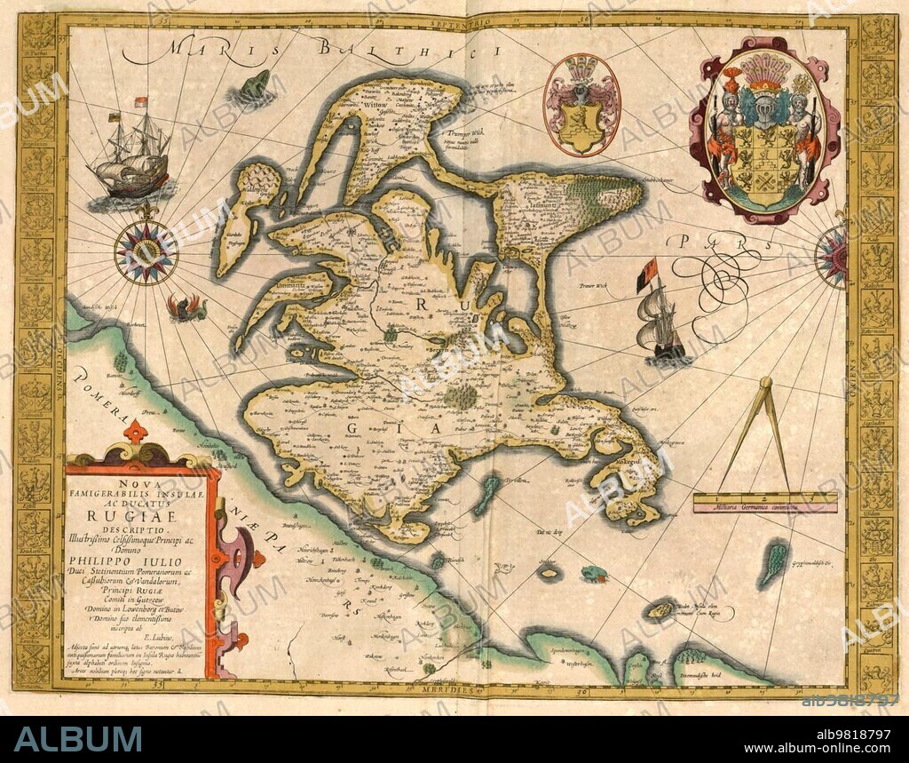 Caption: Atlas; map from 1623; Rugiae; Island of Rügen; Germany; digitally restored reproduction from an engraving by Gerhard Mercator; born as Gheert Cremer; 5 March 1512; 2 December 1594; geographer and cartographer; Europe