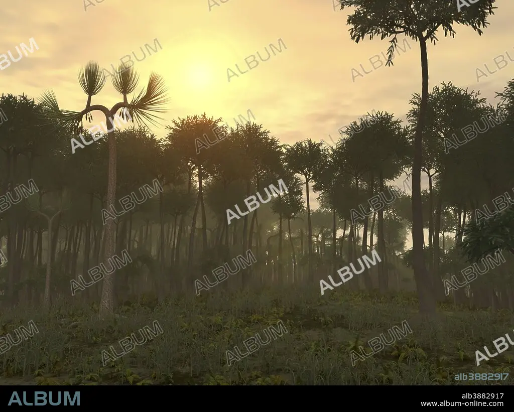 Title: A Carboniferous forest of Midwestern North America 350 million years ago.