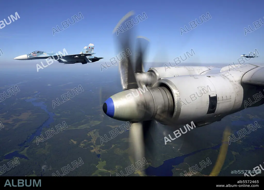 Tu-142MZ anti-submarine airplane in formation with a Su-33 jet fighters of the Russian Navy flying over Saint Petersburg region, Russia.