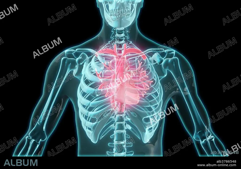Caption: A view of the heart and lungs seen through the rib cage of a human skeleton.