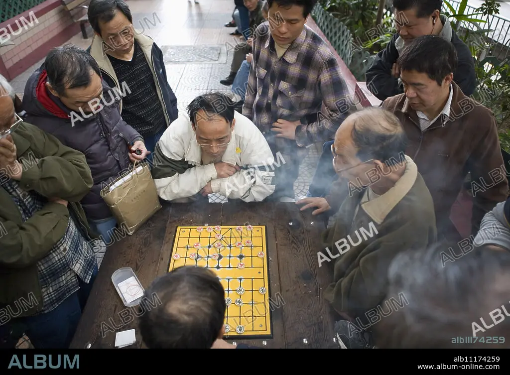 Caption: Two Chinese men playing Chinese Chess in the street, other men watching, Hong Kong, China, Asia