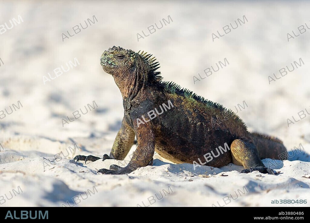 Caption: Galápagos marine iguana (Amblyrhynchus cristatus) sitting in sand on beach, sunbathing, Tortuga Bay, Santa Cruz Island, Galapagos, Ecuador, South America
