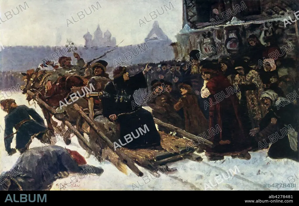 Caption: 'The Boyar Morozova (a study)', 1881, (1965). Sketch for 'Boyarynya Morozova', a painting of 1887, depicting Feodosia's arrest by the Nikonians in 1671. Feodosia Morozova (1632-1675) was one of the leading figures of the Old Believer movement that split from the Russian Orthodox Church after 1666-1667 in protest at religious reforms instigated by Patriarch Nikon. She was arrested and imprisoned, along with her sister, Princess Evdokia Urusova, in the cellar of the St Paphnutius Monastery in Borovsk. Feodosia starved to death there in 1675 and was venerated as a martyr by the Old Believers. Painting in the State Tretyakov Gallery, Moscow. From "Russian Painting of the 18th and 19th Centuries" by Vladimir Fiala. [Artia, Czechoslovakia, 1965]