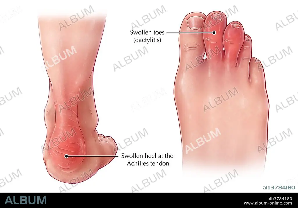 Caption: An illustration of symptoms of psoriatic arthritis, a chronic inflammatory skin disease (psoriasis) which is accompanied by arthritis and other joint problems. Swollen heels around the Achilles tendon, as well as dactylitis, swelling of the toes (creating a sausage-like appearance), are characteristic of psoriatic arthritis.