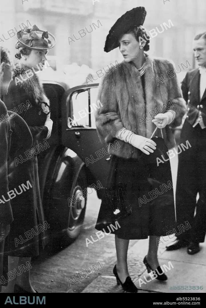 Caption: Duchess of Kent Distinguished Sewing-Bee -- The Duchess of Kent arriving this afternoon.The Duchess of Kent to-day visited a distinguished sewing-bee in Mayfair, London. ***** Its nickname is the "Dip Work Party" because in is run by wives and daughters of members of the diplomatic corps in London. April 3, 1940. (Photo by Topical Press).