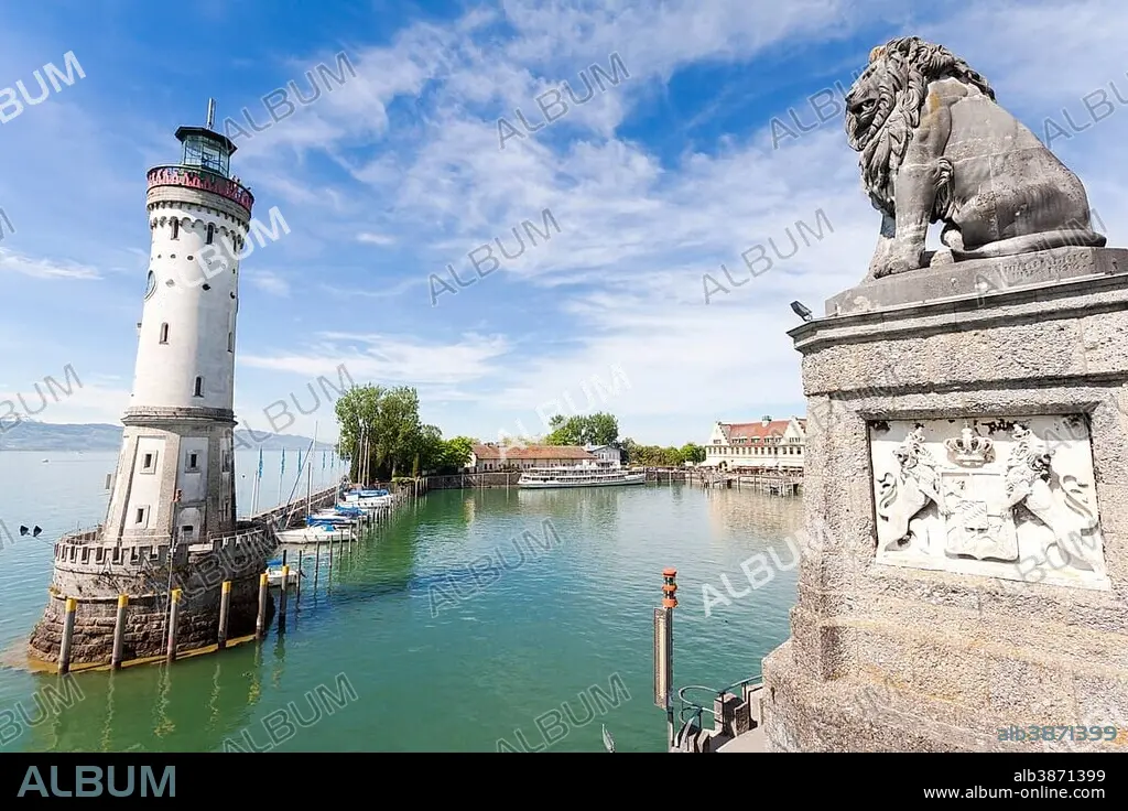 Caption: Lighthouse and the Bavarian lion at the harbor entrance of Lindau on Lake Constance, Bavaria, Germany, Europe, PublicGround, Europe