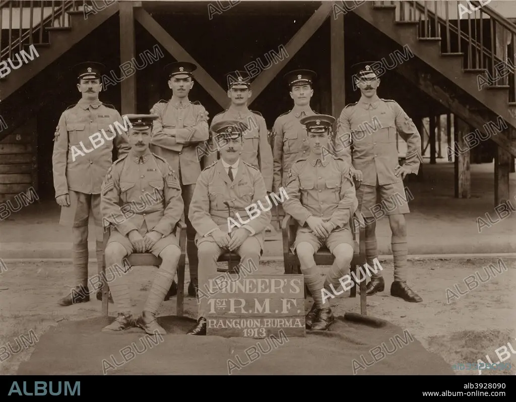 Caption: The Pioneer's of the 1st Royal Munster Fusiliers, Rangoon, Burma, 1913. The Royal Munster Fusiliers was a regular infantry regiment of the British Army. Based largely in Ireland, they had their home depot in Tralee. They were originally formed in 1881 by the amalgamation of two regiments of the former East India Company. They served in India and in the World War I. Following the establishment of the independent Irish Free State in 1922, the five regiments that had their traditional recruiting grounds in the counties of the new state were disbanded. From an album entitled '1st Royal Munster Fusillers, Rangoon, 1913.