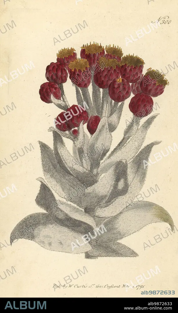 Caption: Everlasting, Syncarpha eximia. Giant cudweed, Gnaphalium eximium. Native to South Africa, imported via the Hammersmith Nursery of Lewis Kennedy and James Lee. Handcoloured copperplate engraving after a botanical illustration from William Curtis's Botanical Magazine, Stephen Couchman, London, 1795.