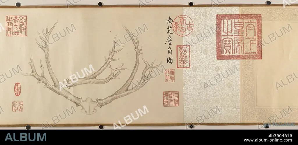 The earlier of the two scrolls depicts the antlers of a spotted deer. In his accompanying inscription, the emperor recalls seeing a gigantic pair of eight-point antlers procured by his grandfather, the Kangxi Emperor (r. 1661-1722), in Central Asia--considered at the time to be an auspicious sign.