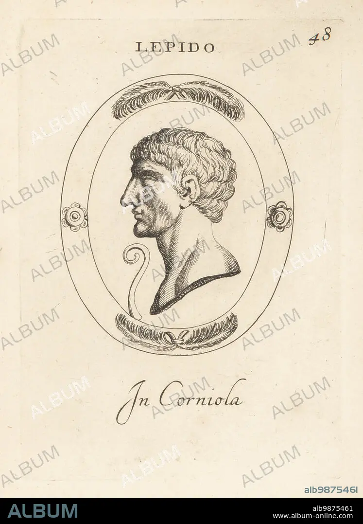 Caption: Bust profile of Lepidus, Triumvir, in carnelian. Marcus Aemilius Lepidus, c. 89-12 BC, Roman general and statesman who formed the Second Triumvirate alongside Octavian and Mark Antony. In frame with palm fronds. Lepido in corniola. Copperplate engraving by Giovanni Battista Galestruzzi after Leonardo Agostini from Gemmae et Sculpturae Antiquae Depicti ab Leonardo Augustino Senesi, Abraham Blooteling, Amsterdam, 1685.