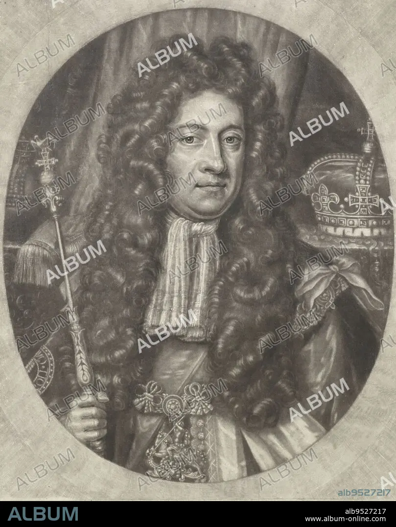 George I, King of Great Britain In his hand the scepter and beside him the crown He wears the order chain of the Order of the Garter In the margin his name and titles, Portrait of George I, King of Great Britain, print maker: Jacob Gole, (mentioned on object), after: Johann Leonhard Hirschmann, (mentioned on object), publisher: Jacob Gole, (mentioned on object), Amsterdam, 1701 - 1724, paper, engraving, h 346 mm × w 255 mm