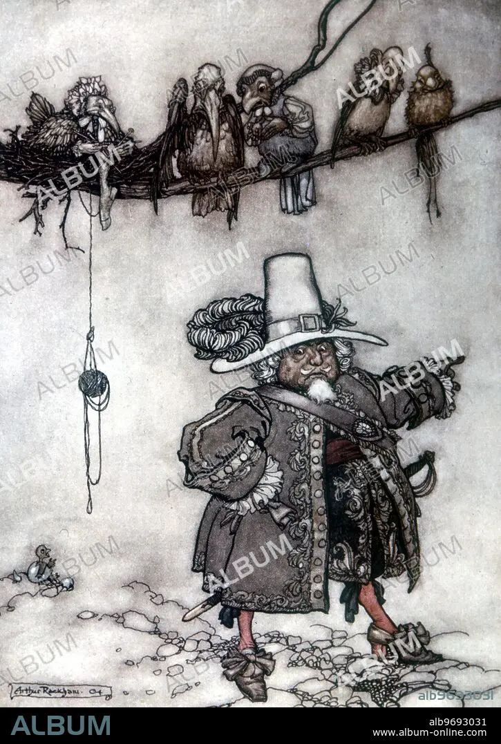 Caption: Fairies - An illustration by Arthur Rackham - from the 1905 edition of Rip Van Winkle - There was one who seemed to be the commander - The story of Rip Van Winkle - who fell asleep in the Catskill mountains after drinking a mysterious brew acquired from some strange little men, and then awoke 20 years later -