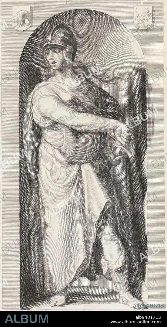 Personification of Wrath (Ira) in a niche, drawing her sword. She is flanked by a crest with a lion and a crest with a bear, Toorn, print maker: Christiaan Lodewijk van Kesteren, intermediary draughtsman: Hendrick Goltzius, 1842 - 1897, paper, etching, engraving, h 392 mm × w 250 mm