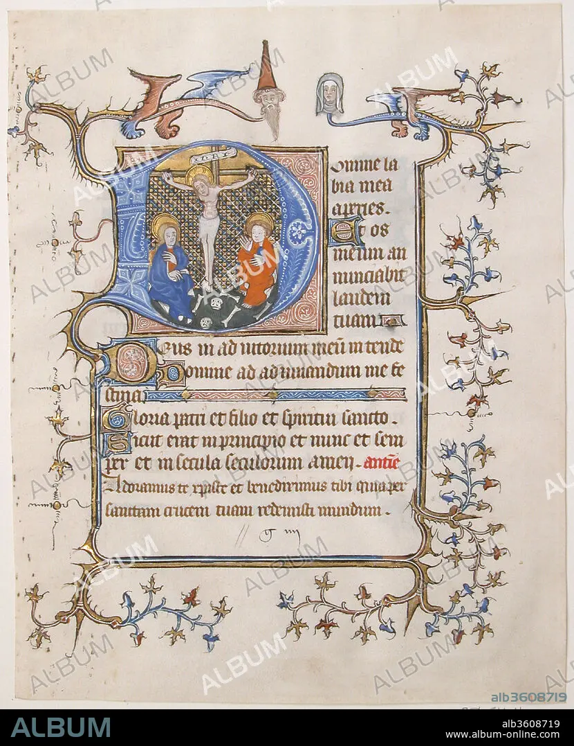 Caption: Manuscript Leaf with the Crucifixion in an Initial D, from a Book of Hours. Culture: North French. Dimensions: Overall: 8 3/16 x 6 1/2 in. (20.8 x 16.5 cm)