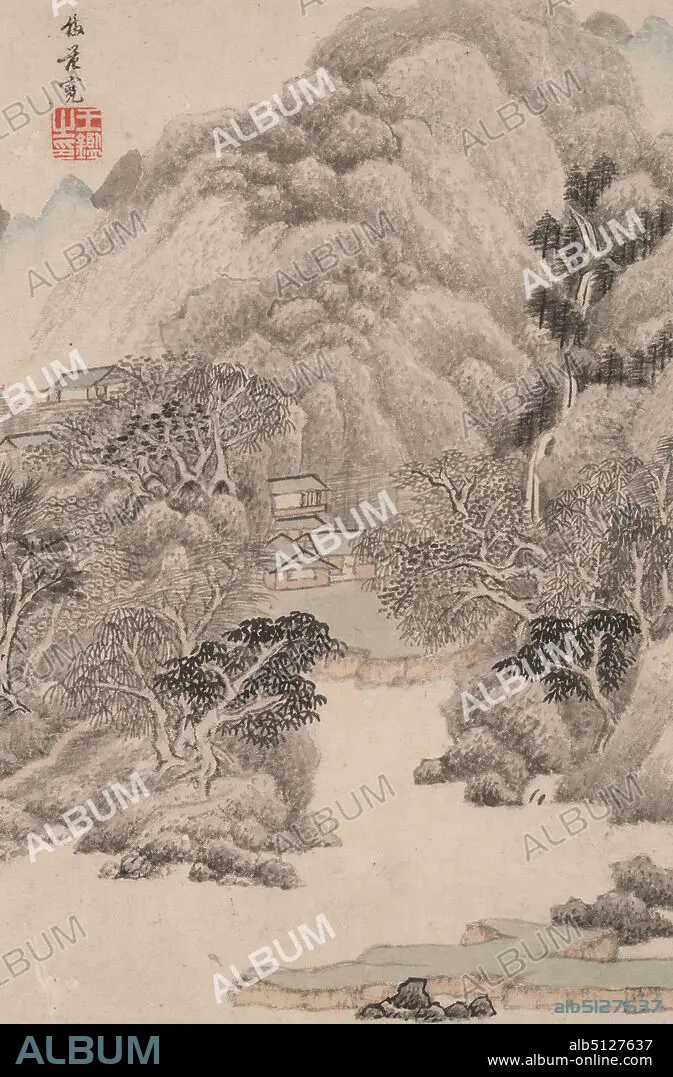 Caption: Artist: Wang Jian, Chinese, 15981677, Landscape in the Style of Various Old Masters: Landscape after Fan Kuan (9901030), Album leaf, ink and color on paper, without mounting: 8 1/2 × 5 3/4 in. (21.6 × 14.6 cm), China, Chinese, Qing dynasty (16441911), Paintings