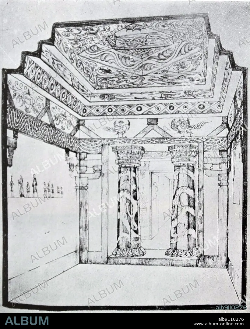 Caption: A sketch of the Twin Column Tomb (???). The Twin Column Tomb is a two-chambered burial tomb dating from Koguryo period, located in Yonggan-gun, Pyeongan Namdo, North Korea. It is listed as a National Treasure of North Korea for the painting on the north wall of the back chamber. The tomb was discovered by the Japanese during their occupation of the Korean Peninsula. Koguryeo (37 BCE - 668).