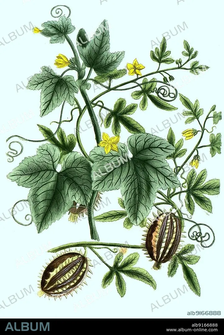 Caption: Americanus and vulgaris, variants of the cucumber (Cucumis), Wild Cucumber, Wild Gherkin, digitally retouched illustration from Phytanthoza iconographica by Johann Wilhelm Weinmann, painter Bartholomäus Seutter and engravers Johann Jakob Haid and Johann Elias Ridinger, 1740