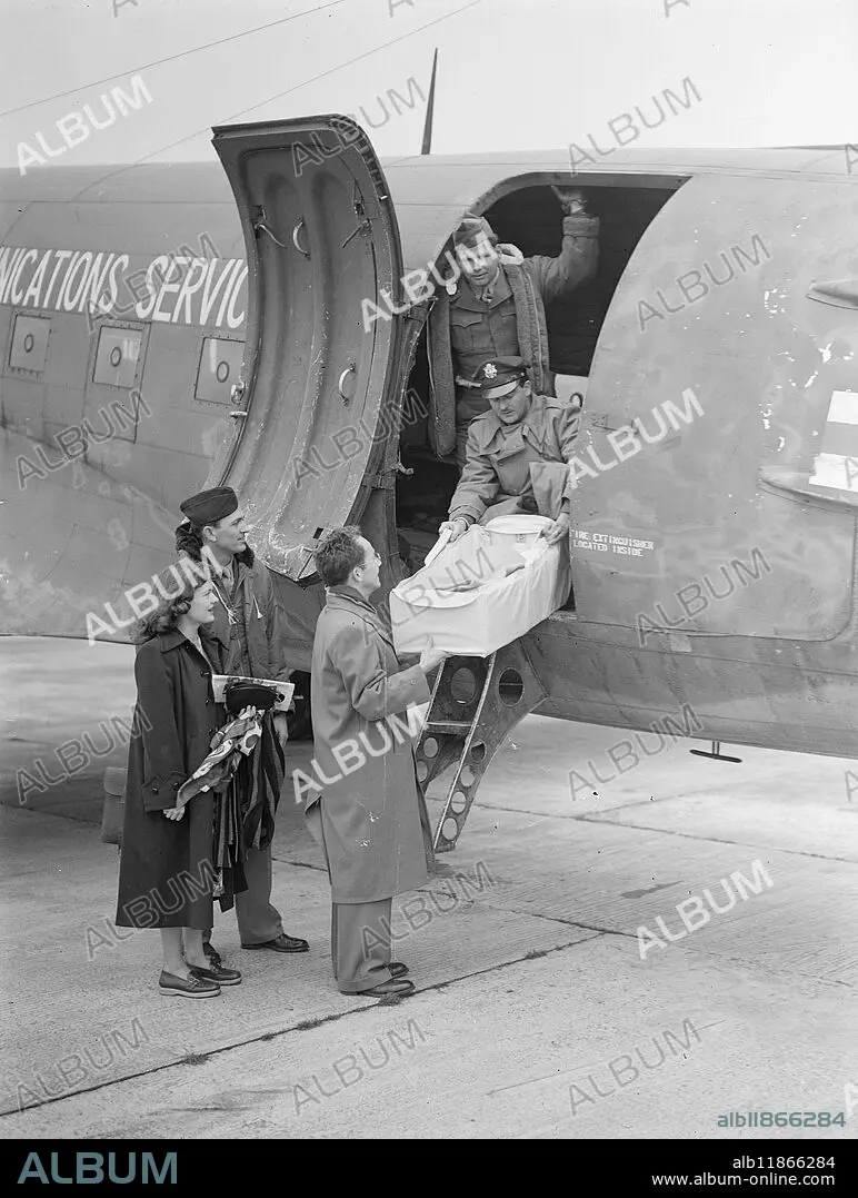 Caption: '' TWO NATIONS '' BABY '' AIRLIFTED. MARY LYNNE JARRETT , the baby that was born in the Cunard White Star's QUEEN MARY - during a trip from New York , was flown by United States Air Force Dakota to her new home in Lancashire . He parents , Mr . and Mrs . Edward .C. JARRETT flew with her . Mr . Jarrett is a radar engineer at the air - lift base at Burton wood , near Warrington . His baby is British because she was born on a British ship but - it can retain dual nationality , both British and American if it likes . PICTURE SHOWS ;- Mr and Mrs . Jarrett watch as the baby , hidden under warm coverings , is carefully placed aboard the Dakota at Southampton Airport , Mr . Jarrett is hatless . 23 February 1949