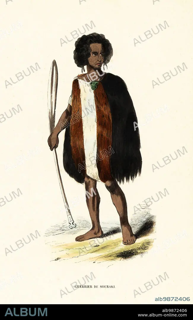 Maori warrior of Souraki (Hauraki Gulf), North Island, New Zealand. He has face tattoos or Ta moko, wears a striped cloak and holds a broad-bladed paddle. Guerrier de Souraki ou Chouraki. Adapted from an illustration by Louis Auguste de Sainson in Dumont dUrvilles Voyage de la corvette lAstrolabe. Handcoloured woodcut by Pannemaker after de Sainson from Auguste Wahlen's Moeurs, Usages et Costumes de tous les Peuples du Monde, (Manners, Customs and Costumes of all the People of the World) Librairie Historique-Artistique, Brussels, 1845.
