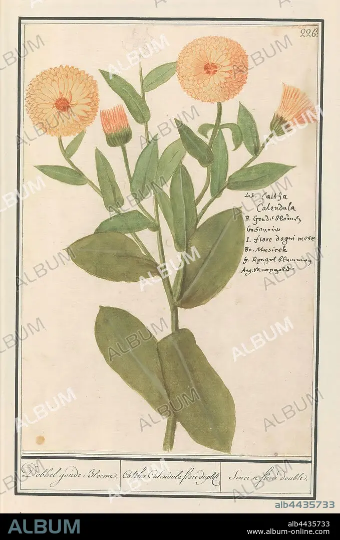 Caption: Marigold (Calendula officinalis) Dobbel goude Bloeme. / Caltha Calendula flore duplice / Souci a fleur double. (title on object), Marigold. Numbered top right: 226. Right the name in six languages. Part of the third album with drawings of flowers and plants. Tenth of twelve albums with drawings of animals, birds and plants known around 1600, commissioned by Emperor Rudolf II. With explanation in Dutch, Latin and French., Anselmus Boetius de Boodt, 1596 - 1610, paper, watercolor (paint), deck paint, chalk, ink, pen, h 290 mm × w 195 mm