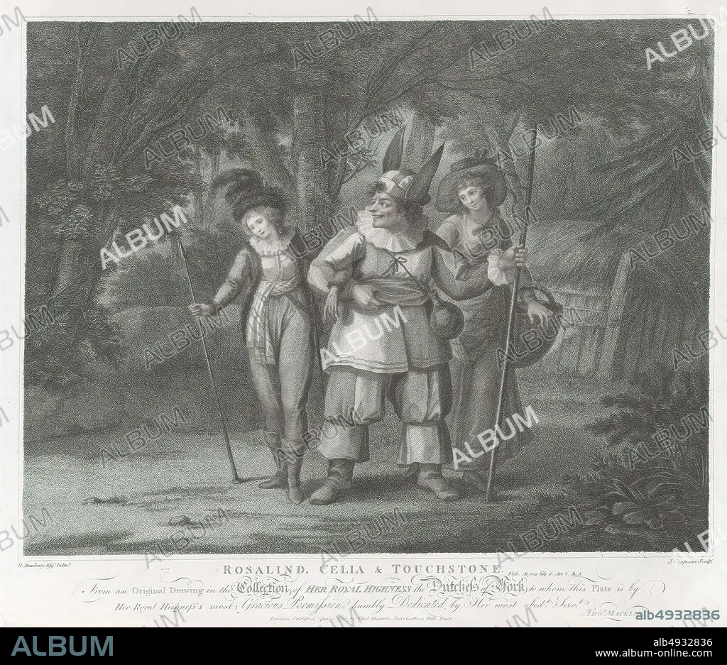 Caption: John Chapman, Rosalind, Celia & Touchstone (Shakespeare, As You Like It, Act 2, Scene 2), Macklin's Shakespeare, John Chapman (British, active 17921823), After Henry William Bunbury (British, Mildenhall, Suffolk 17501811 Keswick, Cumberland), William Shakespeare (British, Stratford-upon-Avon 15641616 Stratford-upon-Avon), Princess Frederica Charlotte (17671820), June 1, 1792, Stipple engraving and etching, Plate: 16 5/16 × 19 in. (41.5 × 48.2 cm), Sheet: 17 1/8 × 21 1/4 in. (43.5 × 54 cm), Prints