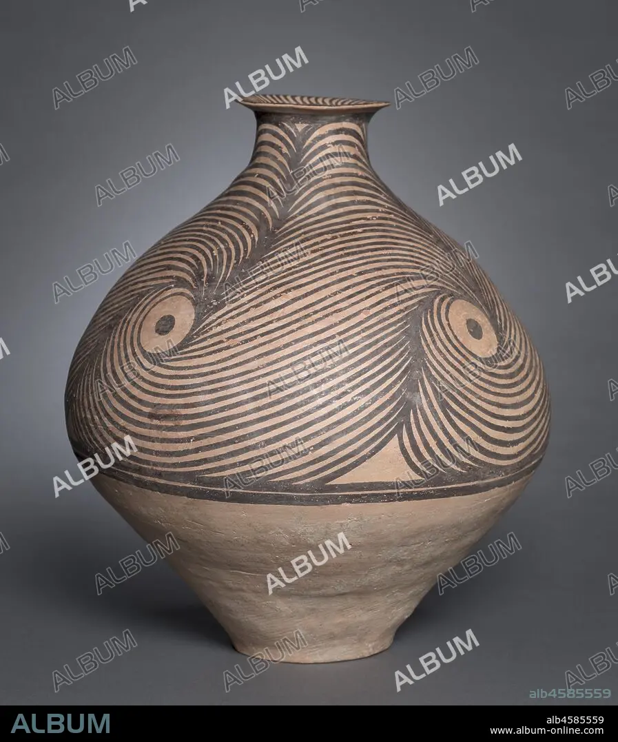 Caption: Jar with Spiral Designs, 3300-2650 BC. This jar is a spectacular example of painted pottery from the Majiayao culture, one of the regional cultures of prehistoric China. Its geometric patterns are probably abstract symbols transformed from a bird image, which may suggest a clan totem or nature spirits. Archaeological work confirms the coexistence of different regional cultures in ancient China, contesting the old belief that the Chinese civilization originated solely along the Yellow River. The artifacts of these cultures manifest distinctive characteristics; each one played a role in the formation of the greater Chinese civilization.
