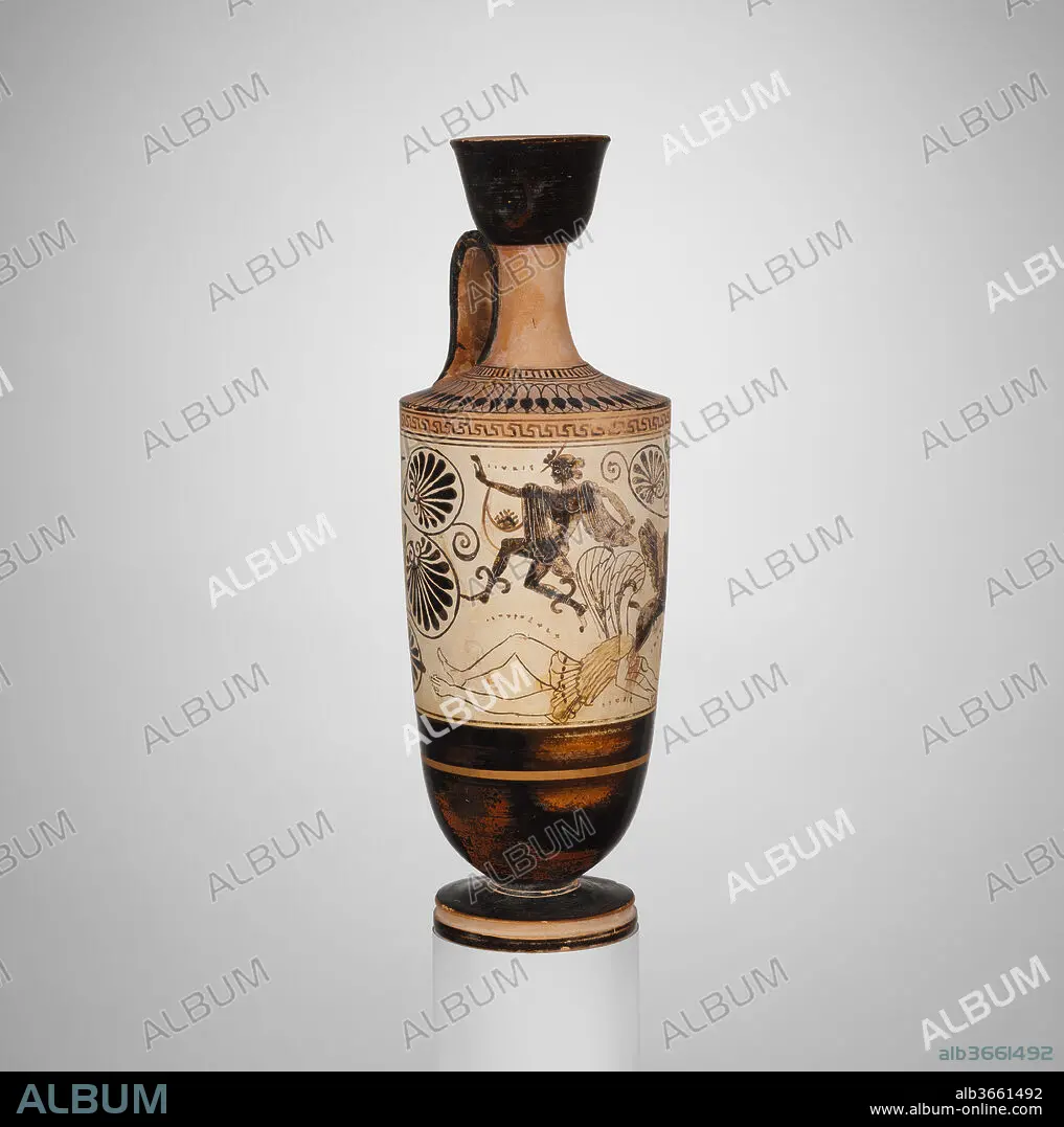 Caption: Terracotta lekythos (oil flask). Culture: Greek, Attic. Dimensions: 9 5/8in. (24.5cm). Date: ca. 500 B.C..