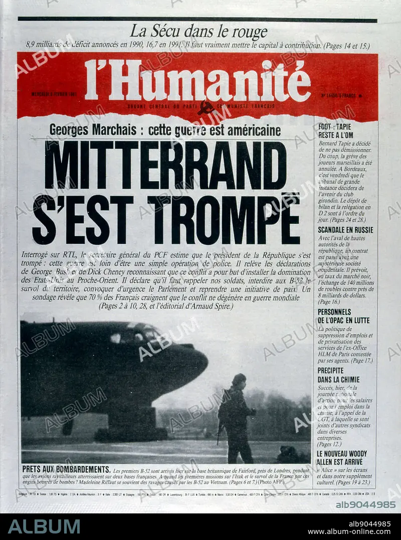 Caption: Front Page of the French Communist publication 'L'Humanite' reporting that President Mitterrand is wrong to involve France in the Gulf War, 8th February 1991. The Gulf War (2 August 1990 28 February 1991), codenamed Operation Desert Shield and Operation Desert Storm, was a war waged by coalition forces from 35 nations led by the United States against Iraq in response to Iraq's invasion and annexation of Kuwait.