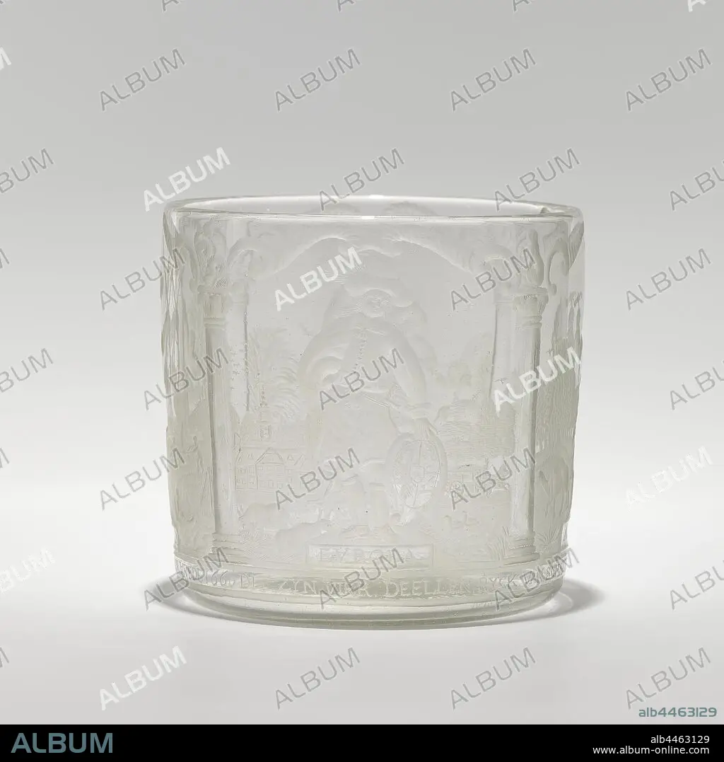 Cup with personifications of the four continents, inserted soil. Cylindrical body. The four continents are depicted on the body. Europe is personified by the Amsterdam mayor Joan Huydecoper (1599-1661), with a feathered hat, standing in front of his Goudesteijn country house, in a landscape with cows and swans. His left hand rests on an oval shield with his weapon, and he stands on a plinth with the inscription EUROPE. In the background on the right a carriage drawn by horses. Asia is personified by a man with a turban and a staff in his right hand. It stands on a plinth with the inscription ASIA in a landscape with trees, a monkey and a dromedary. Africa is personified by a man in an animal skin, seen from behind, in a landscape with palms, an elephant, a lying camel, a walking bird and mountains. In his right hand he holds an arrow, in his left hand a bow, on his back is an arrow quiver. It stands on a plinth with the inscription AFRICA. America is personified by a man with a feather headdress, an arrow quiver on the back, a bow and arrow in the left hand and a parrot in the right hand. It stands on a plinth with the inscription AMERICA on the banks of a river in a landscape with trees, a monkey, a fox and two dogs (?). On the river a man in a rowing boat, on the other side of the river two men are busy with a roasting spit. The four scenes are separated from each other by means of columns, which are connected to each other by volutes. On the capitals of the columns, starting with the column to the left of Europe, are a peacock, a pelican and a parrot. Among the performances a continuous band with the inscription: THIS ZYN FOUR PARTS RYCK OF TREASURES VOLCK AND STEDE: HAER HEIL EXISTS IN THE EARTH DRIVE FLOWERS BY PEACE 1660, America represented allegorically, 'America' (Ripa), Red Indians, American Indians, Amsterdam, Joan Huydecoper van Maarseveen (I), anonymous, 1660, glass, glassblowing, h 8.7 cm × d 9.3 cm d 7.7 cm