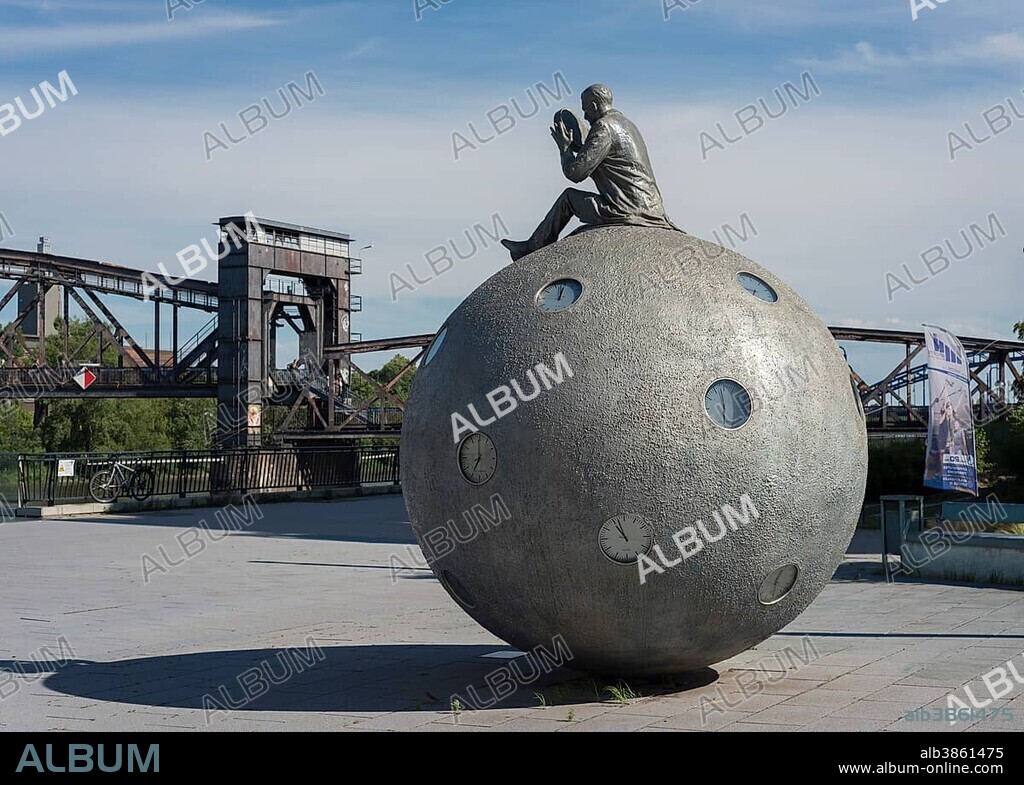 Caption: Sculpture Zeitzähler, time counter, 2008, artist Gloria Friedmann, shows the time at great rivers of the world, Magdeburg, Saxony-Anhalt, Germany, Europe