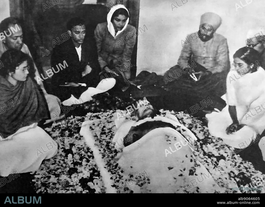 Caption: Photograph of Mahatma Gandhi's corpse. Mohandas Karamchand Gandhi (1869-1948) an Indian lawyer, anti-colonial nationalist, and political ethicist.