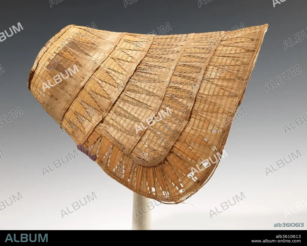 Because of its inherent fragility, the intricate fancy weave worked on this bonnet is rare, as examples like this usually do not survive. The striking color and design of the straw added an additional decorative touch to the bows, corsages, and ruffles that would have originally decorated the bonnet.