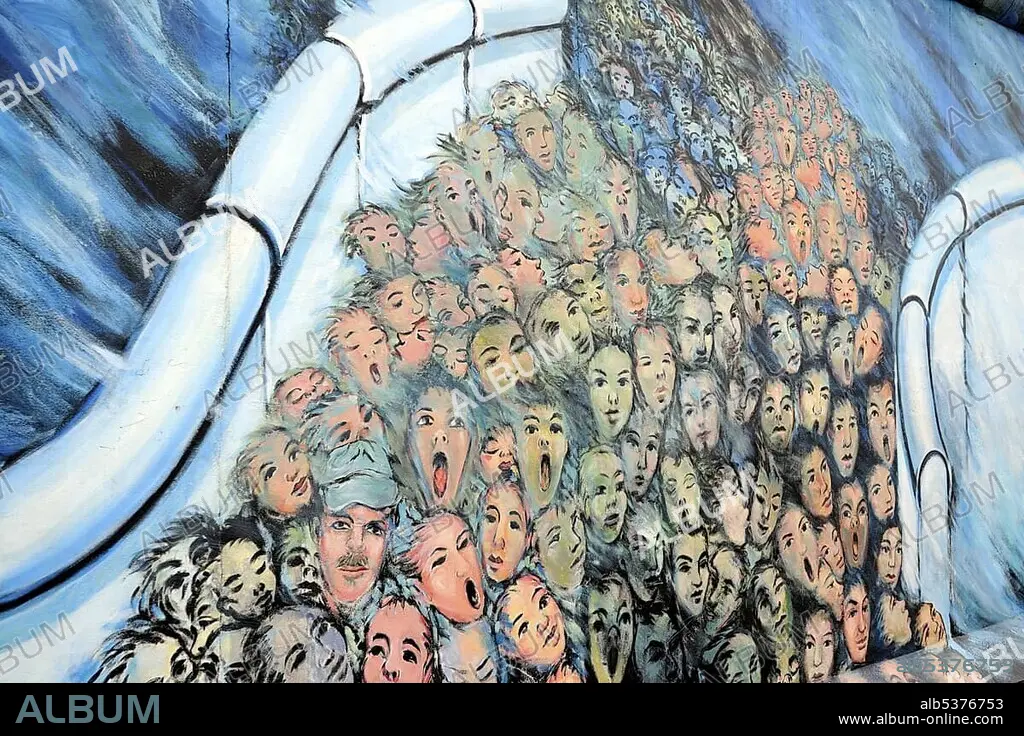 Caption: Kani Alavi, Es geschah im November 1990, Crowd breaking through the Berlin Wall, painting on the Berlin Wall, East Side Gallery, Berlin, Germany, Europe