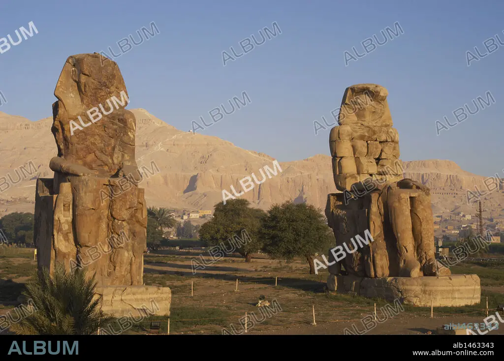 Caption: Colossi of Memnon. Stone statues depicting pharaoh Amenhotep III (14th century B.C.) in a seated position. Panoramic view. Eighteenth Dynasty. New Kingdom. Luxor. Egypt.