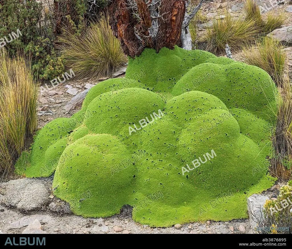 Caption: Yareta or Llareta cushion plant (Azorella compacta) and Queñoa De Altura (Polylepis tarapacana) at the back, Tarapacá Region, Chile, South America