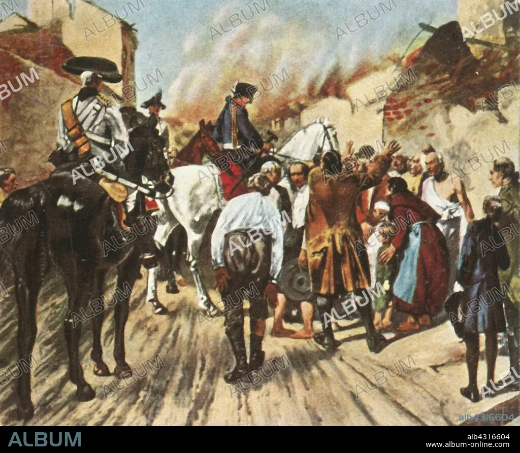 Caption: Frederick the Great in the ruins of Küstrin before the Battle of Zorndorf, 25 August 1758, (1936). 'Friedrich Der Grosse Vor Der Schlacht Bei Zorndorf In Dem Zerstörten Küstrin. 25 August 1758'. King Frederick the Great of Prussia (1712-1786) and his forces fought the Russians near the village of Zorndorf, formerly in the Margraviate of Brandenburg, Prussia, (present-day Sarbinowo, in north-western Poland). From "Bilder Deutscher Geschichte", (Pictures of German History), No.12, cigarette card album. [Cigaretten-Bilderdienst, Altona-Bahrenfeld, Hamburg, Germany, 1936]
