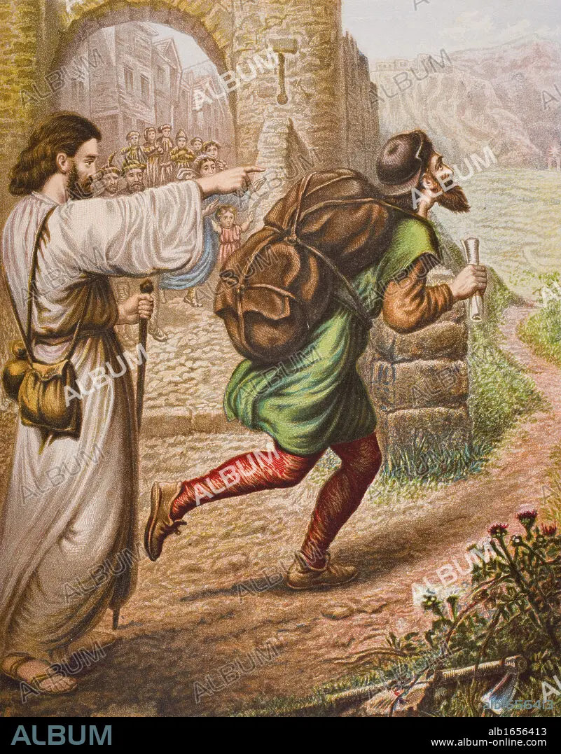 Evangelist directs Christian on his way. From the book "The Pilgrim's Progress" by John Bunyan, from late 19th century edition.