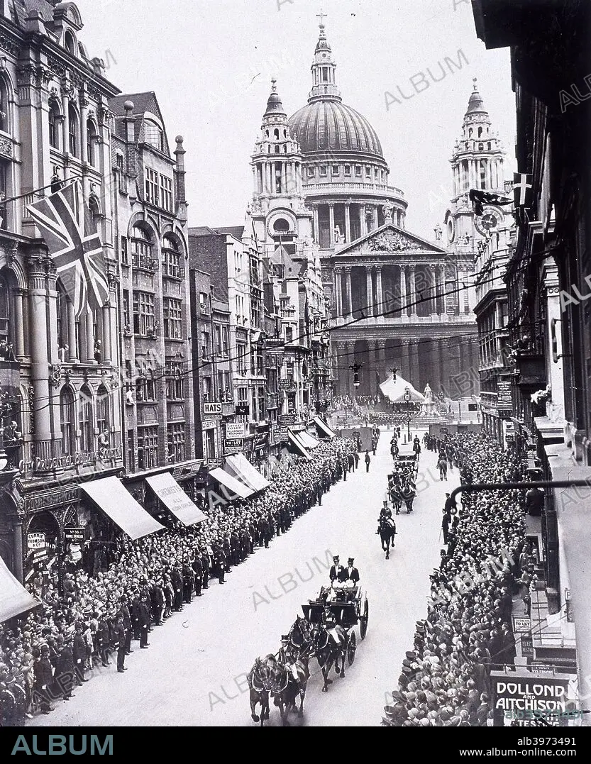 Re-opening of St Paul's Cathedral, London, 1930. View of King George V and Queen Mary, consort of the King, processing down Ludgate Hill, following the re-opening of St Paul's Cathedral on 5th June, 1930. The street is lined with crowds; police keep them off the road. In the bottom right corner there is a shop sign for the opticians Dollond and Aitchison.