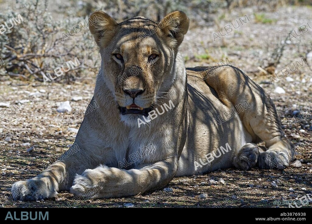 African lion (Panthera leo), lioness lying in the shade of a tree, head up, alert, Etosha National Park, Namibia, Africa.